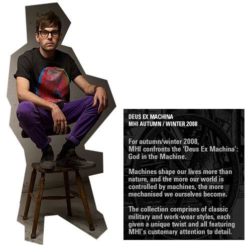 For autumn/winter 2008, MHI confronts the 'Deus Ex Machina': God in the Machine. Machines shape our lives more than nature, and the more mechanised we ourselves become.