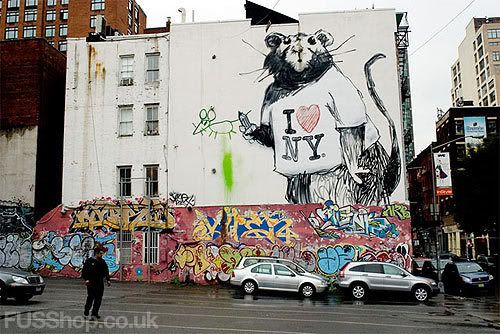 Banksy's latest work features a gigantic three story high commissioned rat adorning the iconic ‘I heart NY’ tee on a wall near Grand street and Wooster in Soho painted by Collosal Media.