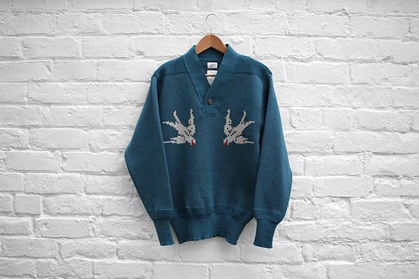 One of the key pieces is the R.A.F Knit PO Sweater - 100% Wool and made in England to R.A.F specifications featuring 'Swallow' design and contrast knit stitch at vital stress points.